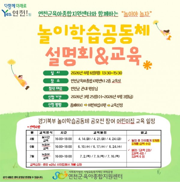 2026년 4월 6일(월) 13시 30분에는 연천군육아종합지원센터와 함께하는 놀이학습공동체 설명회 & 교육이 있습니다.