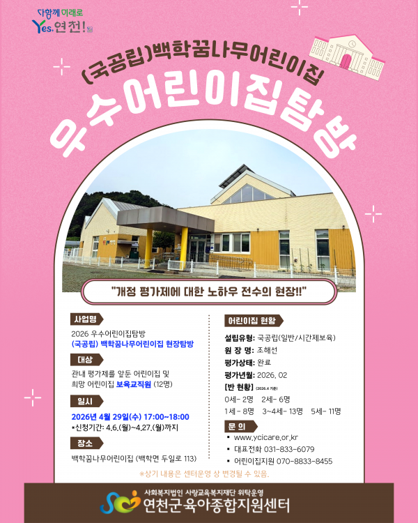 | 대상 | 관내 평가제를 앞둔 어린이집 및 탐방 희망 어린이집 | 교육비 | 무료 |