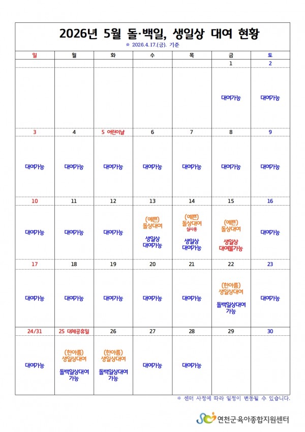 [어린이집지원] 돌백일상·생일상 5월~6월 대여 현황 확인하기 (26.4.17) > 공지사항