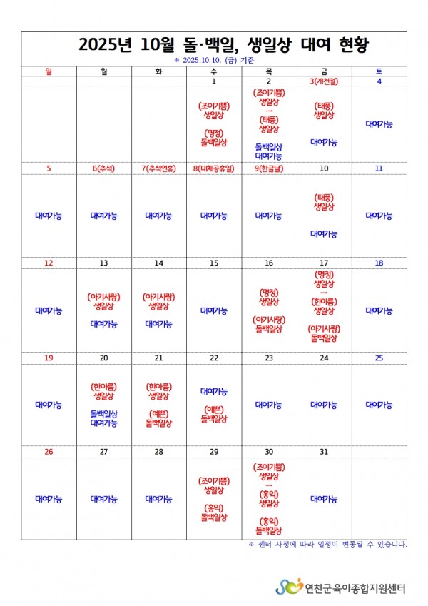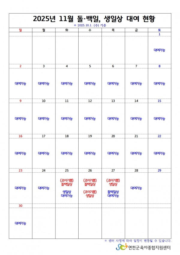 [어린이집지원] ★돌백일·생일상★ 10월~11월 대여 현황 (10.28갱신) > 공지사항