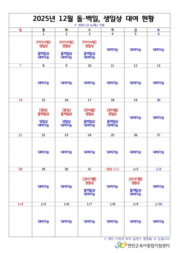 [어린이집지원] ★돌백일·생일상★ 12월~1월 대여 현황 (12.04갱신)