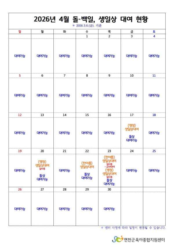 [어린이집지원] 돌백일상·생일상 3월~4월 대여 현황 확인하기 (26.3.6)