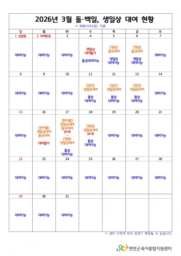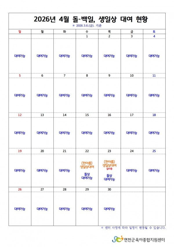 [어린이집지원] 돌백일상·생일상 3월~4월 대여 현황 확인하기 (26.3.6)