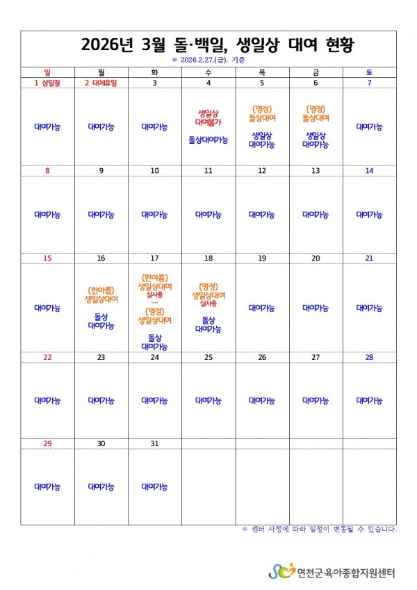[어린이집지원] 돌백일상·생일상 3월~4월 대여 현황 확인하기 (26.2.26)