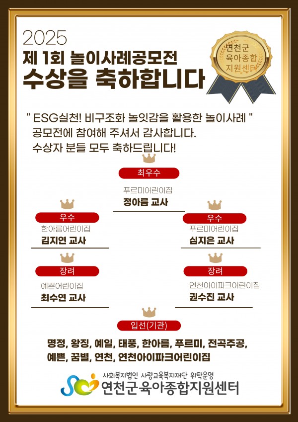 [연천군육아종합지원센터] 제1회 연천군 어린이집 공모전 『2025 ESG 실천을 위한 비구조화 놀잇감을 활용한 놀이사례』 수상…