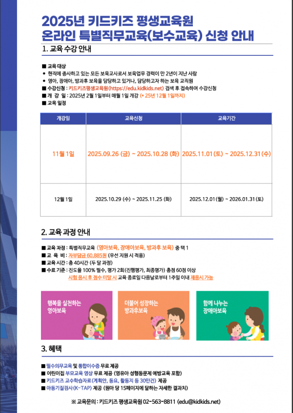 [키드키즈 평생교육원] 보육교직원 온라인 특별직무교육 2025년 11월 개강반 안내