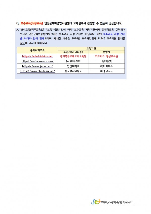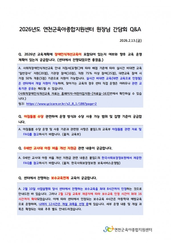 2026년도 연천군육아종합지원센터 원장님 간담회 Q&A (2.10.진행)