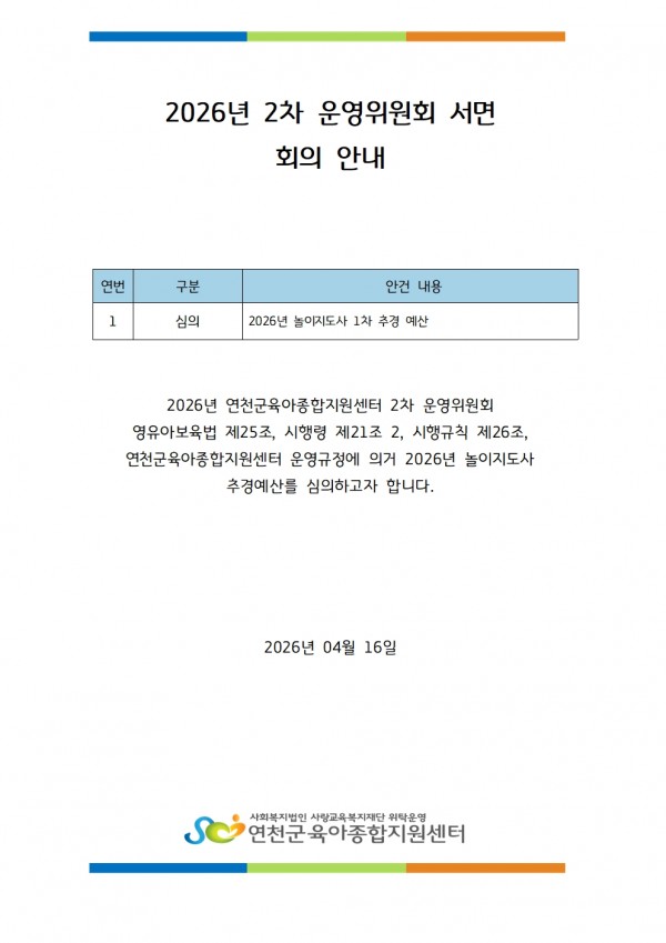 2026년 2차 운영위원회 서면 회의 안내 페이지 정보 작성자 연천군육아종합지원센터 댓글 0건 조회 16회 작성일 26-04-16 15:57 목록 본문 2026년 2차 운영위원회 서면회의 안내 다음글[정보제공] 4월 지구의날 ESG 실천! 26.04.15