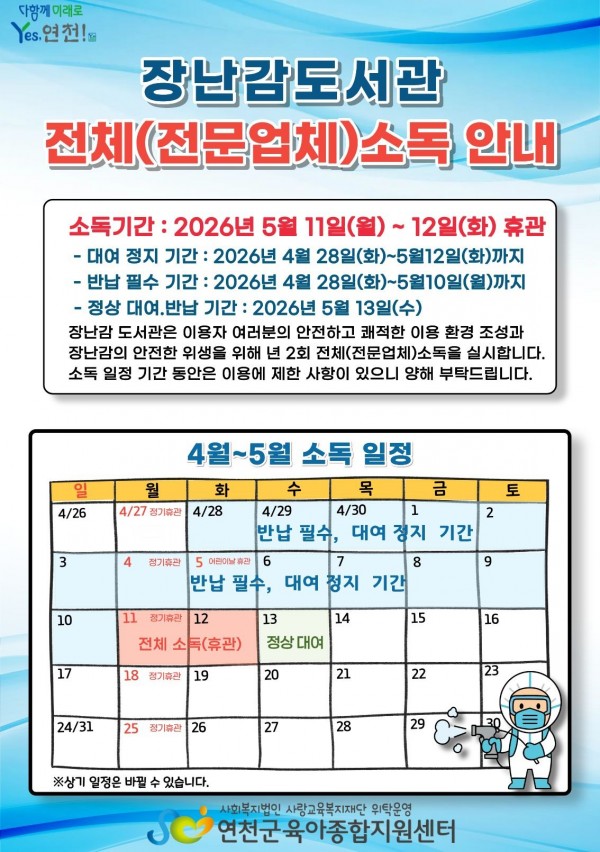 ★장난감 도서관 전체(전문업체) 소독 안내(4.28~5.12 대여 불가)