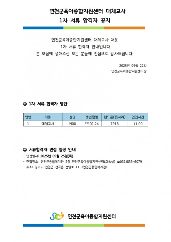연천군육아종합지원센터 대체교사 1차 서류 합격자 공지