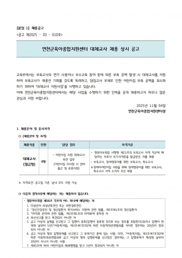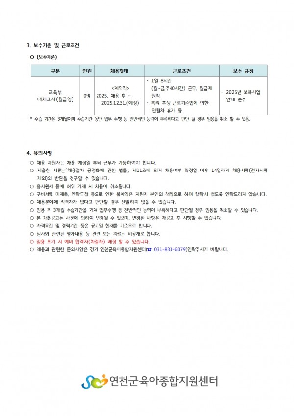 2025년 연천군육아종합지원센터 대체교사 상시 채용 공고 > 채용/모집공고
