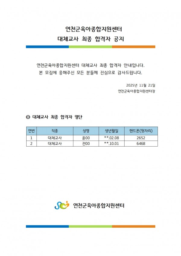 연천군육아종합지원센터 대체교사 최종 합격자 공지