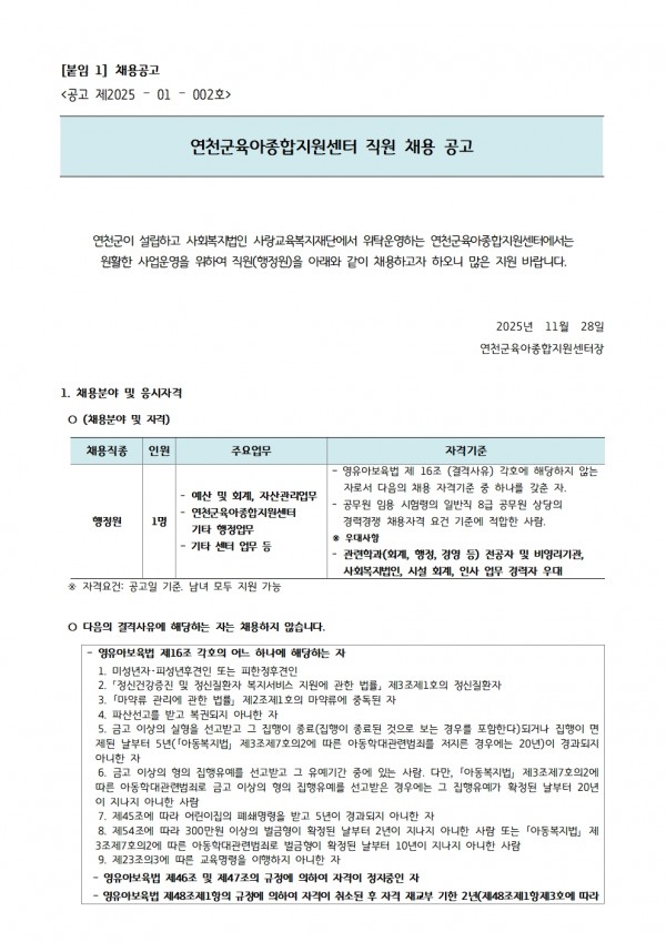 - 다음글연천군육아종합지원센터 대체교사 최종 합격자 공지 25.11.21