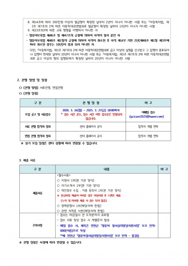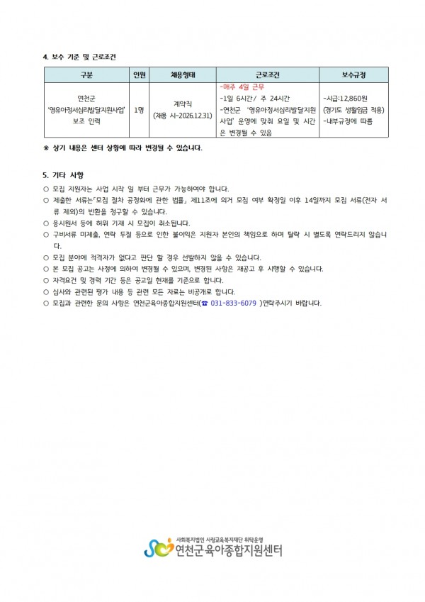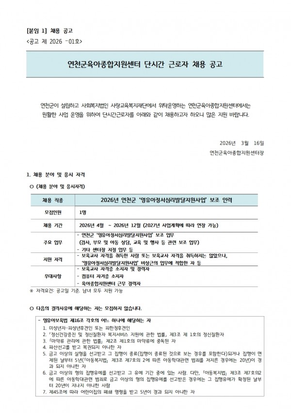 2026년 연천군육아종합지원센터 '영유아정서심리발달지원사업' 보조인력 채용 공고 > 채용/모집공고