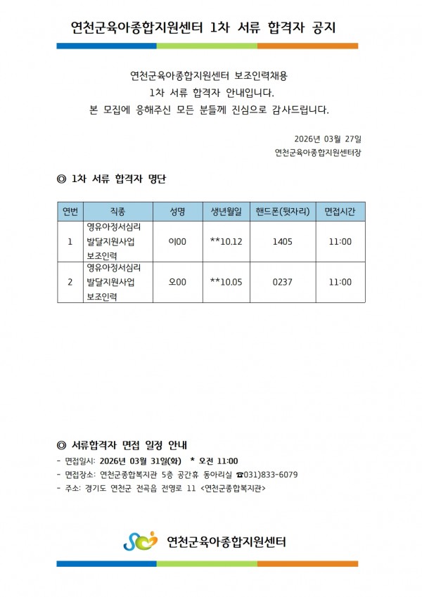 연천군육아종합지원센터 영유아정서발달지원사업 보조인력채용 1차 서류 합격자 공지