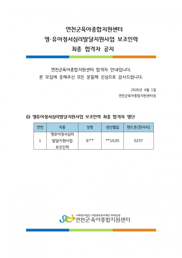 연천군육아종합지원센터 영·유아정서심리발달지원사업 보조인력 최종 합격자 공지