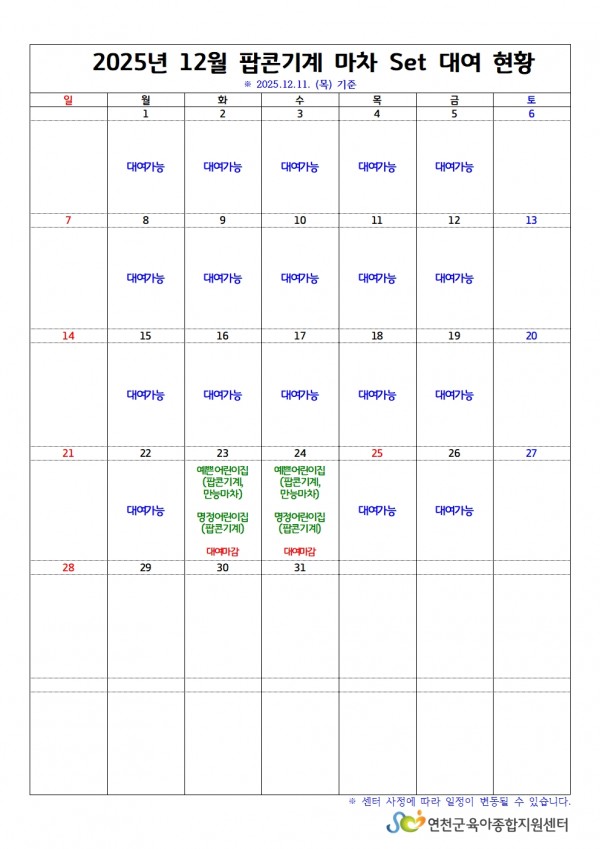 [어린이집지원] ★팝콘기계·마차★ 대여현황 (12.11 갱신)